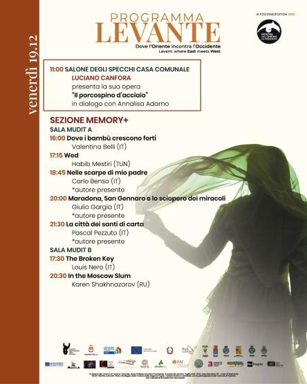 In parallelo, venerdì 19, dalle 16 alle 23, proseguono anche le proiezioni gratuite nel Mudit, il Museo degli Illustri Tarantini (in via Plateja, 51), con la sezione Memory+ che prevede nella sala A i film: “Dove i bambù crescono forti” di Valentina Belli (ore 16), “Wed” di Habib Mestiri (ore 17.15), “Nelle scarpe di mio padre” alla presenza dell’autore, Carlo Benso (18.45), “Maradona, San Gennaro e lo sciopero dei miracoli” di Giulio Gargia alla presenza dell’autore (ore 20), “La città dei santi di carta” di Pascal Pezzuto alla presenza dell’autore (21:30). Nella sala B, proiezione delle pellicole “The Broken Key” di Louis Nero (17.30) e, alle 20:30, “In the Moscow Slum” di Karen Shakhnazarov.