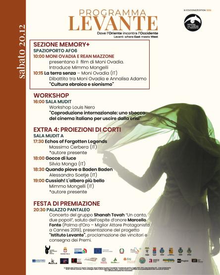 Nel pomeriggio, la Mostra del Cinema di Taranto si sposta al Mudit, il Museo degli Illustri Tarantini (ore 16) per il workshop Louis Nero“Coproduzione internazionale: uno sbocco del cinema italiano per uscire dalla crisi”. A seguire, proiezioni di corti italiani della sezione Extra 4. Si comincia alle 17:30 con la visione di “Echos of Forgotten Legends” di Massimo Cerbera che sarà presente alla proiezione; alle 18 “Gocce di luce” di Silvia Monga, alle 18:30 “Quando piove a Baden Baden” di Alessandro Soetje. Poi, alle 19, “Cussiah! L’albero più bello” di Mimmo Mongelli che sarà presente.