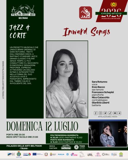 “Canzoni interiori” è una raccolta di brani originali della cantante e compositrice jazz Sara Rotunno, tratti dall’omonimo disco, insieme a standard jazz poco convenzionali e a classici italiani senza tempo. Il filo conduttore è il racconto di emozioni e sensazioni intime, attraverso un dialogo introspettivo che prende forma nei testi e negli arrangiamenti, intrecciando il jazz contemporaneo con la potenza espressiva della melodia. Solitamente presentato in forma acustica con Francesco Schepisi al pianoforte ed Enzo Bacco al sax, in occasione del concerto presso il Palazzo delle Arti di Beltrani il progetto si arricchisce anche della presenza di una sezione ritmica d’eccellenza, con Nico Catacchio al contrabbasso e Gianlivio Liberti alla batteria.
